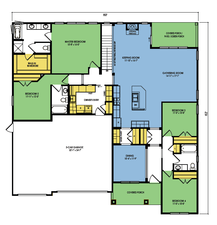 A part of our Family Series, the Canyon floor plan features 4 bedrooms and 3 bathrooms with a footprint of 60x62 feet and 2438 total square feet of living space. Floor Plan #FM167