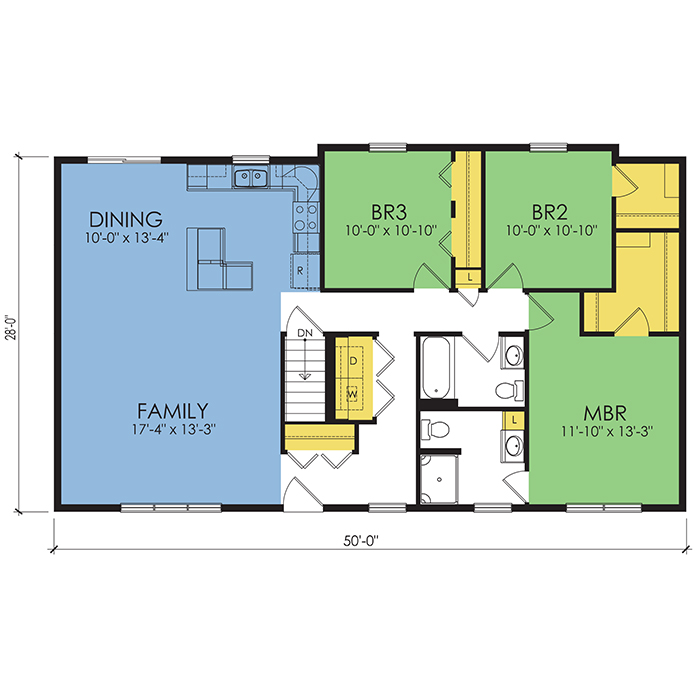 A part of our dream series, the tamarack floor plan features 3 bedrooms and 1.5 bathrooms with a foot print of 44x30 feet and 1342 total square feet of living space.