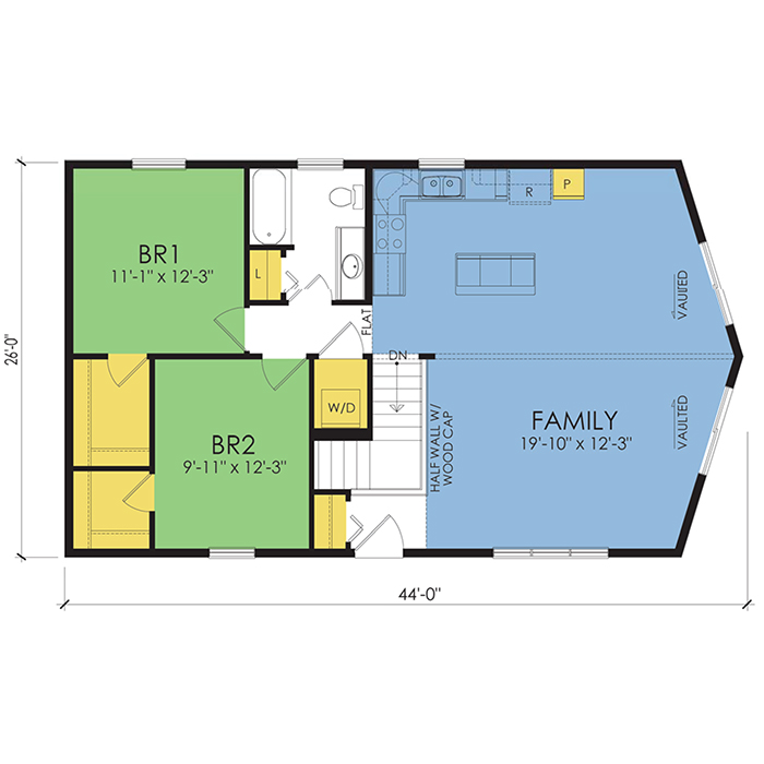 A part of our dream series, the tamarack floor plan features 3 bedrooms and 1.5 bathrooms with a foot print of 44x30 feet and 1342 total square feet of living space.