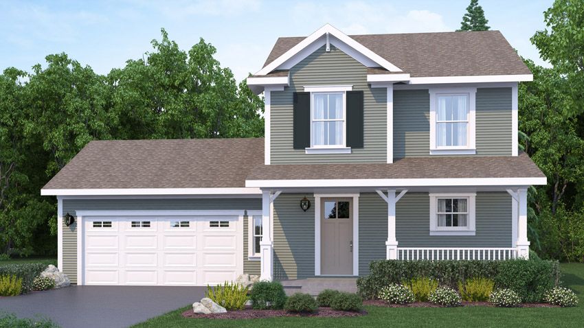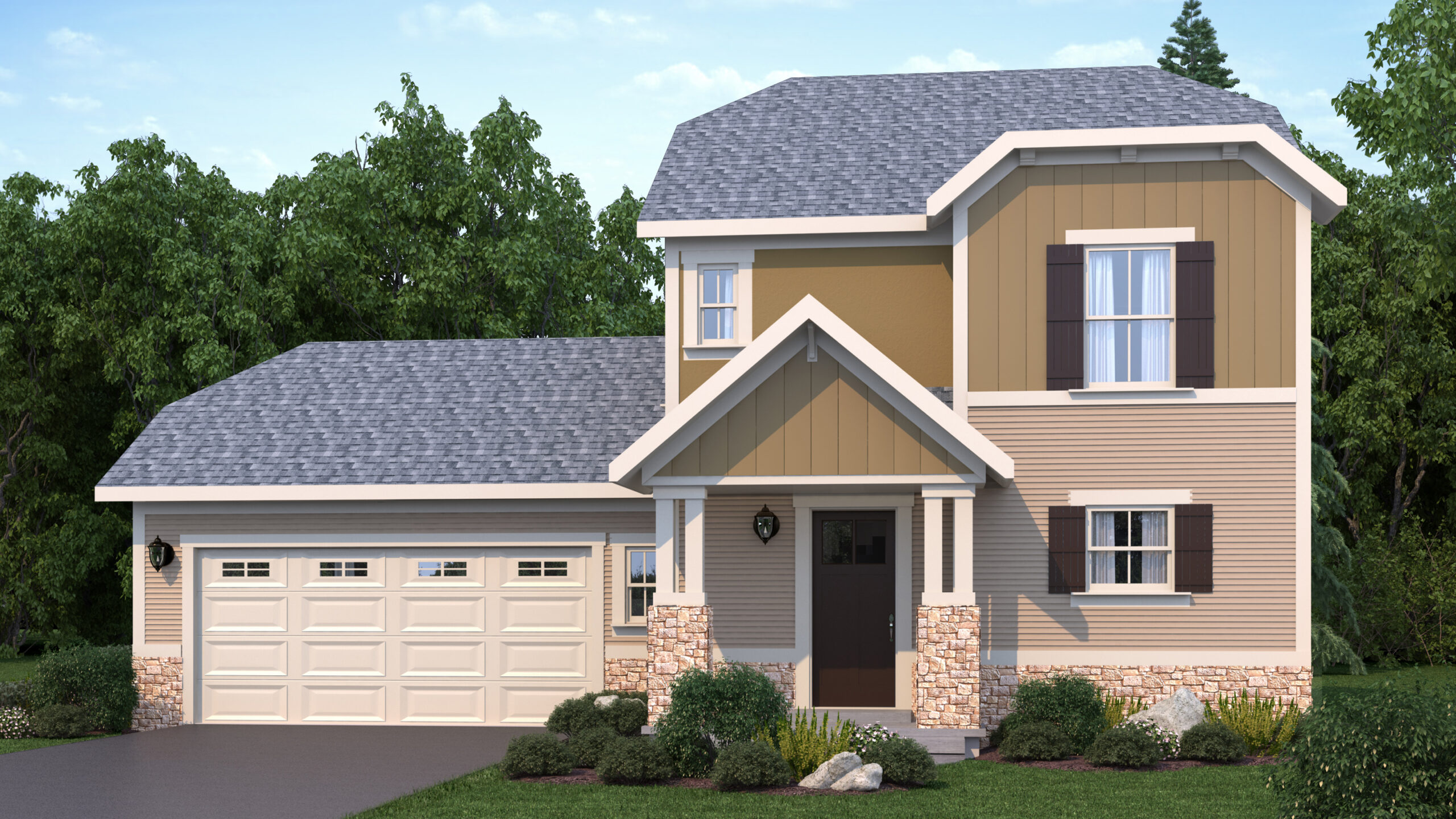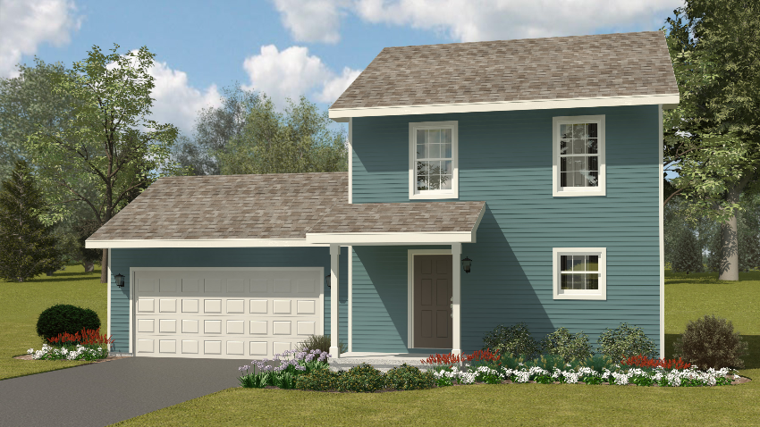 Exterior rendering of Tamarack floor plan, 3 bed/1.5 bath. Four Square exterior style. Four Square